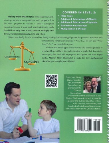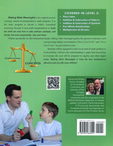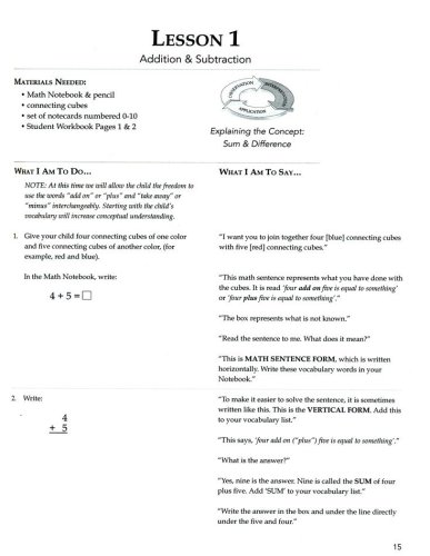 Written specifically for homeschoolers, Making Math Meaningful doesn't require additional training, but rather simply guides the parent to introduce each concept using simple conversations (The "What I Am To Do" and "What I Am To Say" sections). Rather than teaching kids to memorize math facts and formulas, students will progress from utilizing concrete objects, to pictorial representations, to symbolic/numeric representations in word-problem format. This approach helps them apply their knowledge to everyday life and understand the problems they're being asked to solve. Each concept is first introduced with manipulatives and students are given time to work with them in order to figure out solutions for themselves – teaching themselves how to think mathematically in the process.