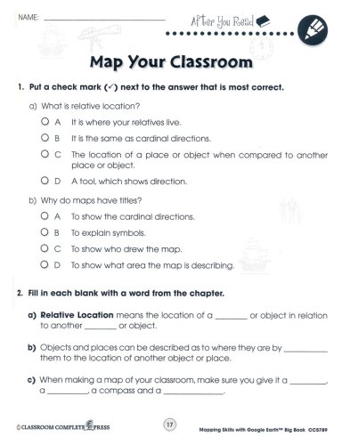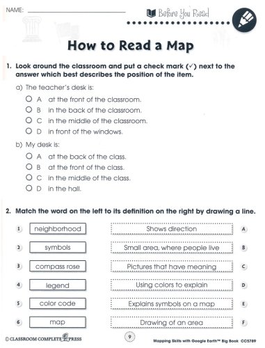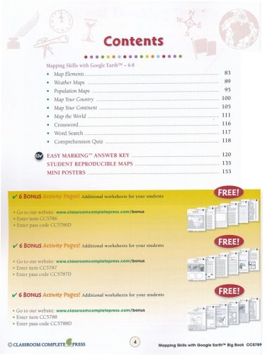Help students learn how to read and create maps with the "Mapping Skills with Google Earth, Big Book" series from Classroom Complete Press. The included teacher's guide features a critical thinking skill rubric and assessment rubric along with an overview of the workbook. Student worksheets include reading passages and activities that include 'before you read' and 'after you read' activities. Map activities will begin with learning basic map symbols to understand latitude, longitude, different types of communities, and more. The "easy marking" answer key features columns of answers that allow teachers to simply line up the worksheet with the key to quickly see the correct answers.