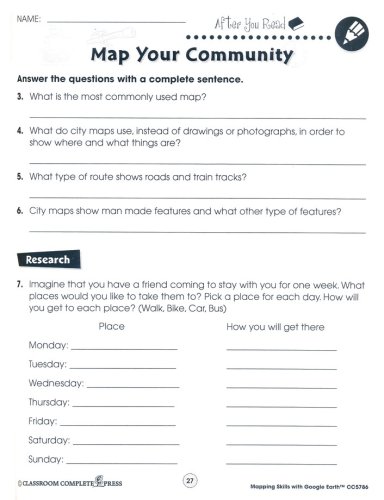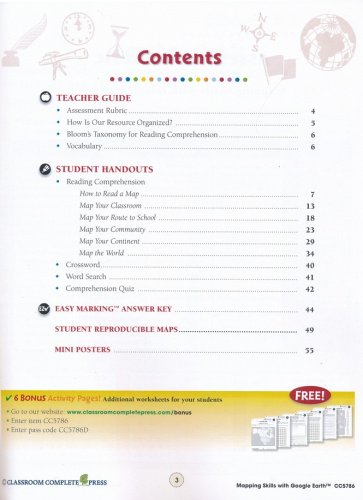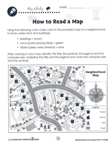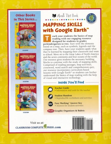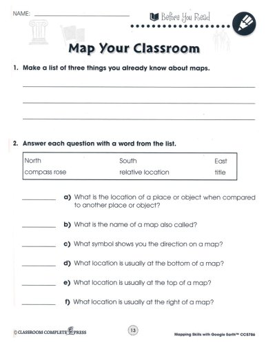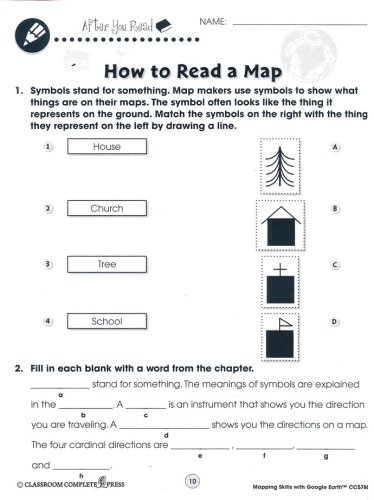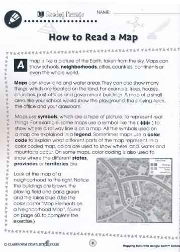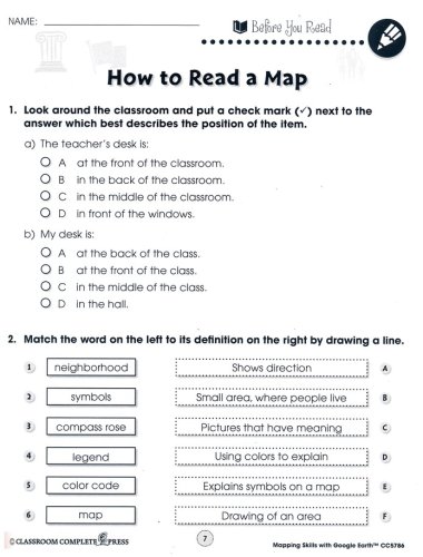 Help students learn how to read and create maps with the "Mapping Skills with Google Earth," series from Classroom Complete Press. The included teacher's guide features a critical thinking skill rubric and assessment rubric along with an overview of the workbook. Student worksheets include reading passages and activities that include 'reading passage' and 'after you read' activities. Map activities will begin with learning basic elements found on a map, such as symbols, legends, and the compass rose. They will learn about the Great Lakes of North America, the seven continents and more. The "easy marking" answer key features columns of answers that allow teachers to simply line up the worksheet with the key to quickly see the correct answers.