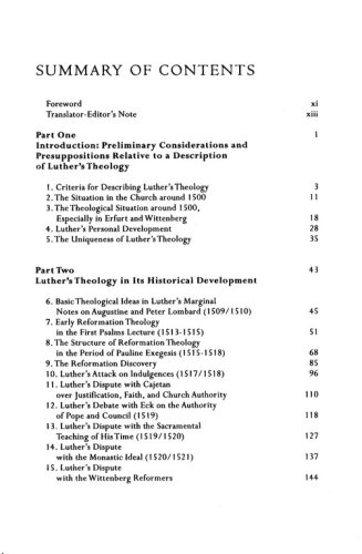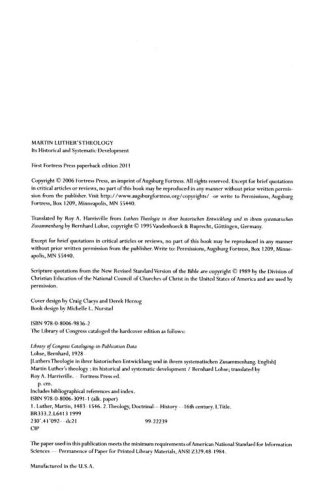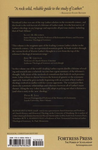 This definitive analysis of the theology of Martin Luther surveys its development during the crises of Luther's life, then offers a systematic survey by topics. Containing a wealth of quotations from less-known writings by Luther and written in a way that will interest both scholar and novice, Lohse's magisterial volume is the first to evaluate Luther's theology in both ways. Lohse's historical analysis takes up Luther's early exegetical works and then his debates with traditions important to him in the context of the various controversies leading up to his dispute with the Antinomians. The systematic treatment shows how the meaning of ancient Christian doctrines took their place within the central teaching of justification by faith.