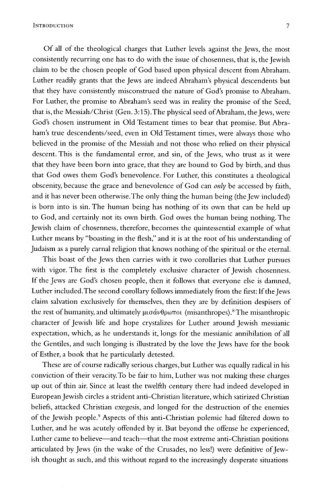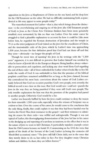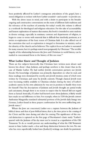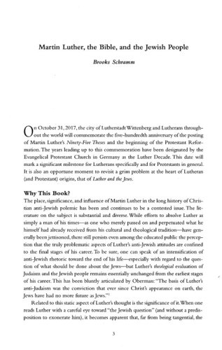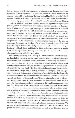 The place and significance of Martin Luther in the long history of Christian anti-Jewish polemic has been and continues to be a contested issue. It is true that Luther's anti-Jewish rhetoric intensified toward the end of his life, but reading Luther with a careful eye toward "the Jewish question," it becomes clear that Luther's theological presuppositions toward Judaism and the Jewish people are a central, core component of his thought throughout his career, not just at the end. It follows then that it is impossible to understand the heart and building blocks of Luther's theology without acknowledging the crucial role of "the Jews" in his fundamental thinking.