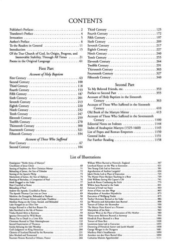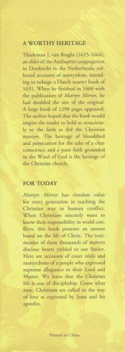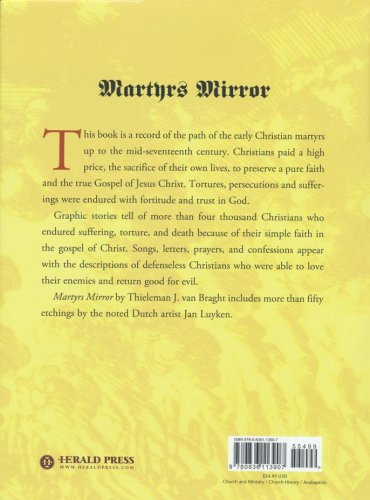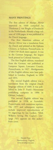 Thieleman J. van Braght's gigantic work, the record of Christian faith and endurance from the first century to the Anabaptist persecutions in the sixteenth century. Here are stories of men and women who died for their belief. Written in 1659 by a Dutch Mennonite to strengthen the faith of his fellow believers and translated into German in 1748 through 1749 at the time of the French and Indian War for the same reason. In 1886 it was translated into English. A challenge to many generations.