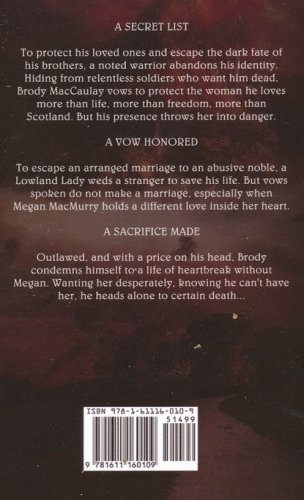 A SECRET LIST To protect his loved ones and escape the dark fate of his brothers, a noted warrior abandons his identity. Hiding from relentless soldiers who want him dead, Brody MacCaulay vows to protect the woman he loves more than life, more than freedom, more than Scotland. But his presence throws her into danger. A VOW HONORED To escape an arranged marriage to an abusive noble, a Lowland Lady weds a stranger to save his life. But vows spoken do not make a marriage, especially when Megan MacMurry holds a different love inside her heart. A SACRIFICE MADE Outlawed, and with a price on his head, Brody condemns himself to a life of heartbreak without Megan. Wanting her desperately, knowing he can't have her, he heads alone to certain death…