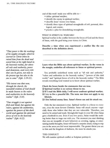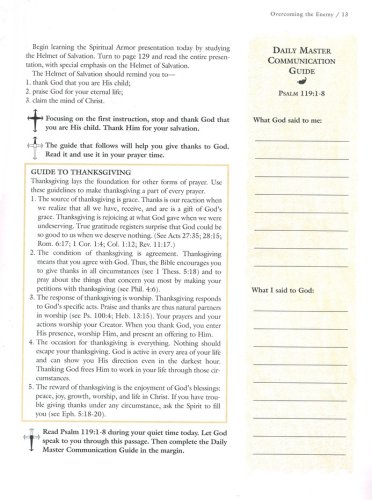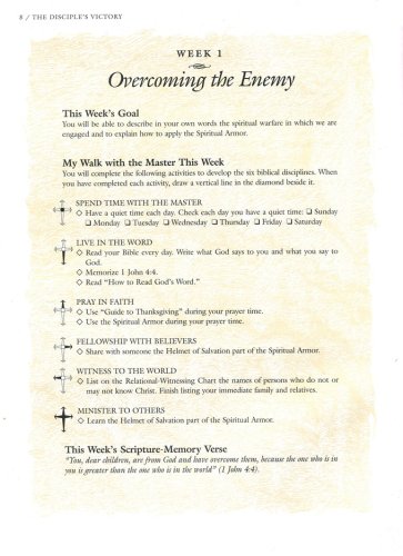 MasterLife 3: Disciple's Victory – Member Book is the third Bible study in the series of four that helps Christians gain victory over the world, the flesh, and the devil. This six-week study helps believers develop their prayer lives and gain skills in using God's Word. A prayer retreat follows this study in which disciples experience God directing their future. Additional available resources include leader helps and videos.