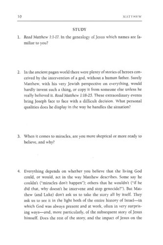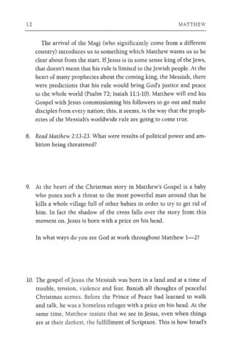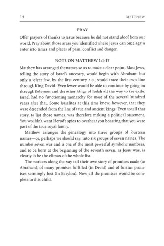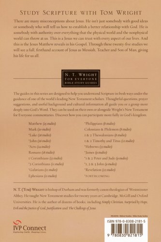 With a scholar's mind and a pastor's heart, Tom Wright walks you through Matthew in this guide designed especially with everyday readers in mind. Perfect for group use or daily personal reflection, this study uses the popular inductive method combined with Wright's thoughtful insights to bring contemporary application of Scripture to life. This guide by Tom Wright can be used on its own or alongside his New Testament for Everyone commentary on Matthew. It is designed to help you understand Scripture in fresh ways under the guidance of one of the world's leading New Testament scholars. Thoughtful questions, prayer suggestions, and useful background and cultural information all guide you or a group more deeply into God's Word. Discover how you can participate more fully in God's kingdom.