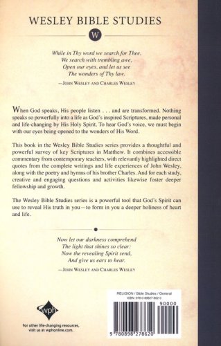 This book in the Wesley Bible Studies series provides a thoughtful and powerful survey of key Scriptures in Matthew. It combines accessible commentary from contemporary teachers, with relevantly highlighted direct quotes from the complete writings and life experiences of John Wesley, along with the poetry and hymns of his brother Charles. And for each study, creative and engaging questions and activities likewise foster deeper fellowship and growth.