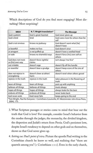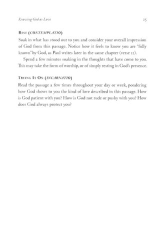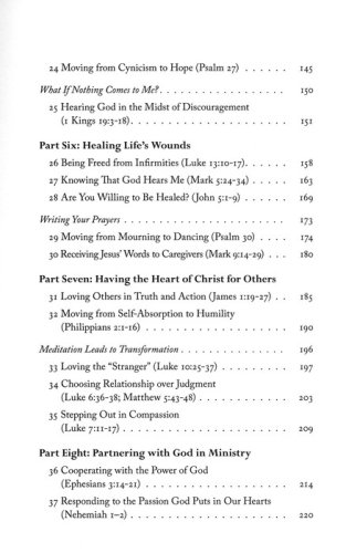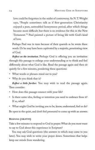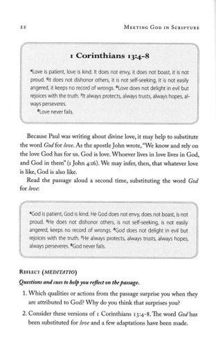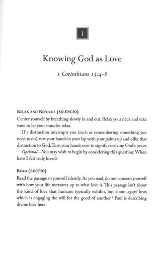 an introductory space of quiet along with an optional preparatory exercise; the full text of a passage from Scripture with explanations of unusual or important words, and with cultural and historical background as needed; cues to help us enter the text; space to contemplate the passage, respond to God in prayer and rest in his presence; and an exercise to "try on" one of the main ideas of the passage in our daily lives.