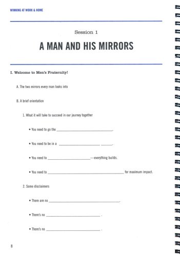 Men's Fraternity: Authentic Manhood: Winning at Work & Home – Viewer Guide by Robert Lewis challenges men to step forward, meet their responsibilities, and establish their manhood. This study focuses on the chief responsibilities men have as husbands, fathers, and breadwinners. Two mirrors are presented to help men evaluate how they are doing in life: the mirror of work and career, and the mirror of home and family. Participants will evaluate chief responsibilities of how a man successfully relates to a woman and how a man rightly engages in his work. (16 sessions)
