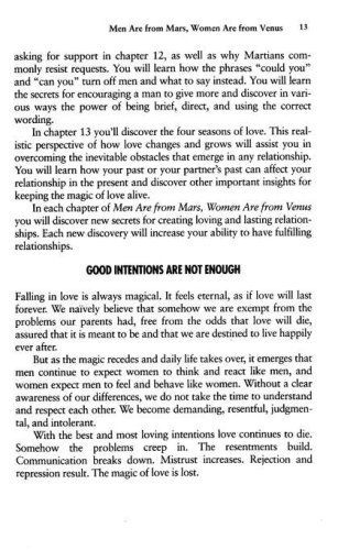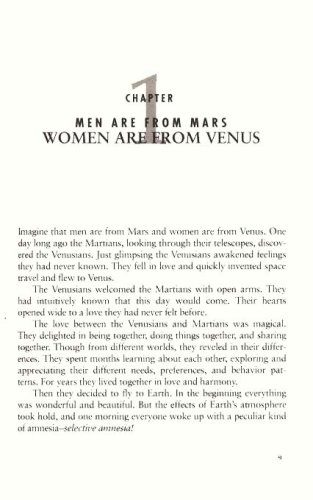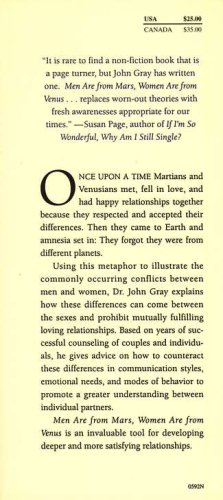 Based on years of successful counseling of couples and individuals, Men Are from Mars, Women Are from Venus has helped millions of couples transform their relationships. Now viewed as a modern classic, this timeless book has helped men and women realize how different they can be in their communication styles, their emotional needs, and their modes of behavior—and offers the secrets of communicating without conflicts, allowing couples to give intimacy every chance to grow.