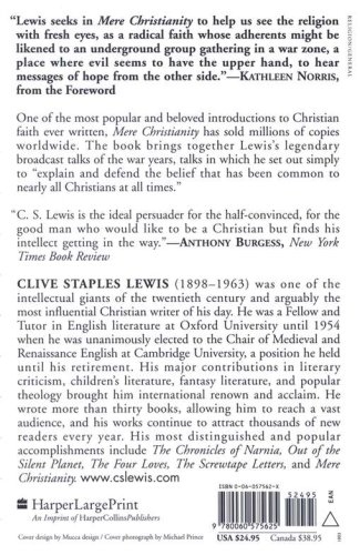 In 1941 England, when all hope was threatened by the inhumanity of war, C. S. Lewis was invited to give a series of radio lectures addressing the central issues of Christianity. More than half a century later, these talks continue to retain their poignancy. First heard as informal radio broadcasts on the BBC, the lectures were published as three books and subsequently combined as Mere Christianity. C. S. Lewis proves that "at the center of each there is something, or a Someone, who against all divergences of belief, all differences of temperament, all memories of mutual persecution, speaks with the same voice," rejecting the boundaries that divide Christianity's many denominations. This twentieth century masterpiece provides an unequaled opportunity for believers and nonbelievers alike to hear a powerful, rational case for the Christian faith.