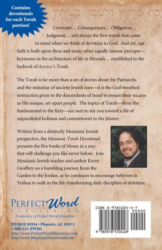 Presenting the five books of Moses from a distinctly Messianic Jewish perspective, the Messianic Torah Devotional will forever change the way you see your relationship with God. The topics of Torah–from the fundamental to the fiery–are sure to stir you toward a life of unparalleled holiness and commitment to the Master, Yeshua. With devotional writings corresponding to each of the Torah portions as defined by the traditional Jewish annual reading cycle, the Messianic Torah Devotional illuminates Israel's distinguishing covenant as a rich source of nourishment for the hungry disciple of Messiah. Join Messianic Jewish teacher and author Kevin Geoffrey in this third offering from the Messianic Devotional series, as he leads you on a humbling journey from the Garden to the Jordan, and encourages you to continue developing the life-transforming discipline of devotion.