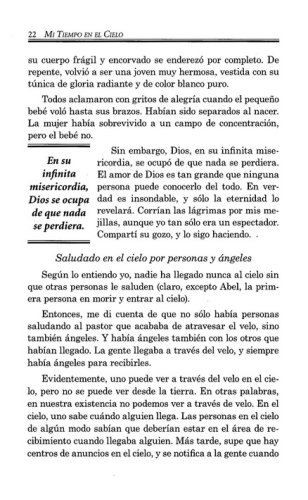 Las cosas que vi me ministraron, y creo que también ministrarán a los que lean este libro. Jesús me dijo: "Nunca te olvides de lo mucho que te amo y de lo que he hecho por ti. Nunca te olvides de cuánto amo a aquellos con los que regresas y del lugar que he preparado para ellos, y de cuánto los amo".