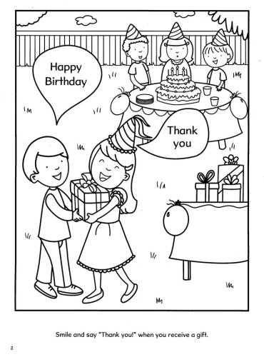 While they're having fun coloring, kids can receive painless lessons in polite behavior. These 41 illustrations portray kids thanking each other, greeting adults, respecting the elderly, and following proper etiquette in many other day-to-day situations. Helpful captions reinforce the suggestions for good manners.