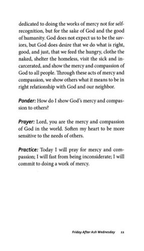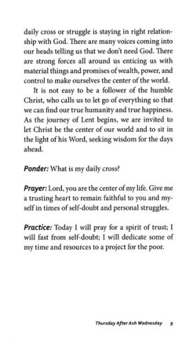 Each day you focus on one scriptural theme through breaking open God's Word. The reflection then reaches out to us in our busy lives to consider what the Word has to offer us during the holidays. Next, a thought to ponder brings home the message for you-to really apply the reading and reflection to your life. Now say a prayer, an offering and petition to the Lord; finally a practice, a chance to change your daily routine in simple ways to bring God's love to your life and prepare for the paschal mystery and Easter season.
