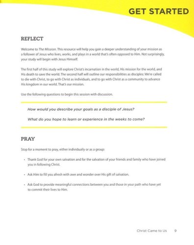 The study includes an introduction to the weekly session topic, guided prayer options, and Scripture focus with text and narrative explanation that drives the weekly meeting. Also included each week are discussion questions and group exercises that reinforce the primary teaching points of each topic. Individual study and out-of-group activities have all been crafted to help users take their next step as disciples of Christ. These optional activities include but are not limited to reading plans, prayer exercises, personal study, and journaling.