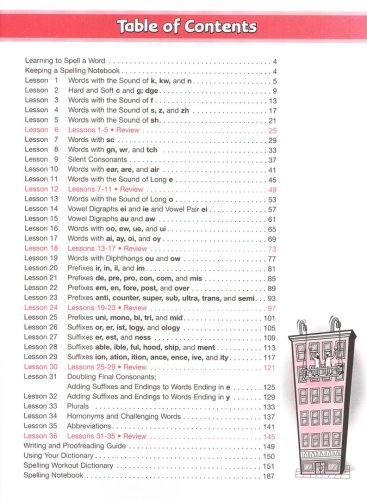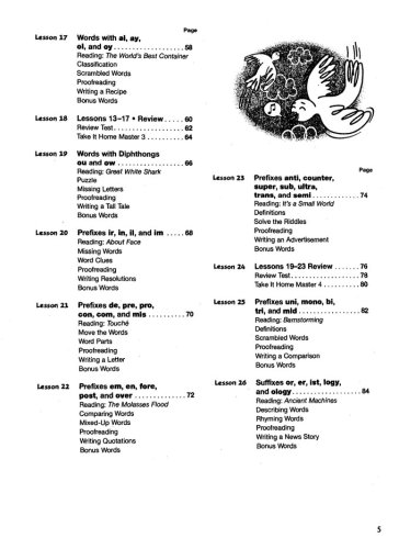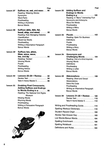 The 36 lessons in the Student Workbook each focus on a spelling rule, pattern, or origin. Level F, Grade 6 covers silent consonants; words with diphthongs ou and ow; prefixes; syllables; suffixes; plurals; abbreviations; and more.