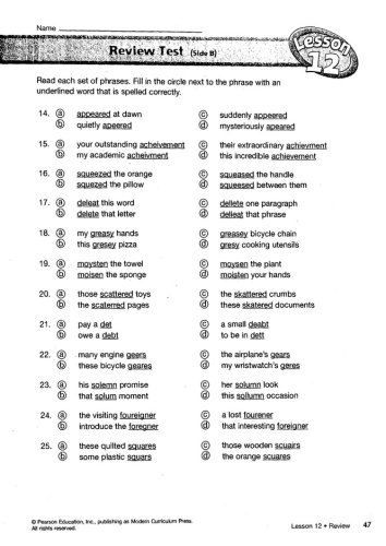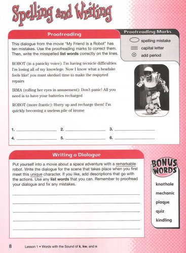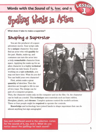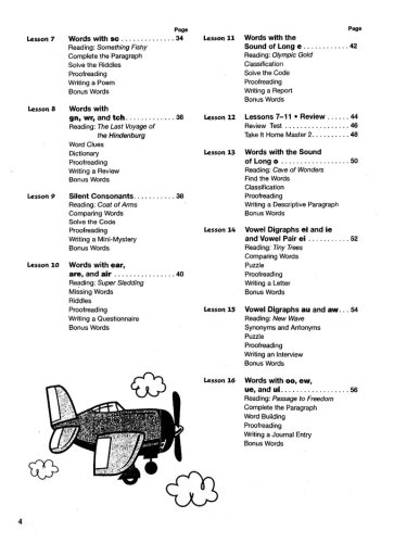 The Teacher's Edition provides a 3-day and 5-day schedule; activities for reinforcing spelling patterns; example dictation sentences for the lessons' pretest and final test; bonus words; review lessons; tips for ESL learners; a writer's corner; and take-it home masters. Reduced black-and-white copies of the student pages have the correct answers overlaid; teaching notes are provided in the margins. The scope & sequence follows MCP's "Plaid Phonics" so curriculum can be correlated. Objectives state the goal of each lesson.