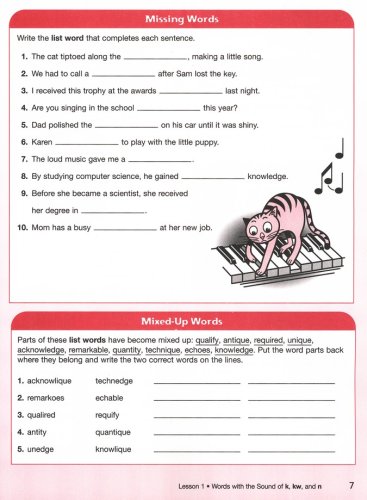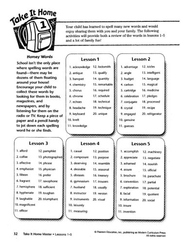 The course is organized around a test-study method. Students take a pretest, self-correct and rewrite words, study through the practice exercises, and take a final test. Student lessons include fun riddles and puzzles, and conclude with a wrap-up and review; cumulative reviews of multiple chapters are also provided.