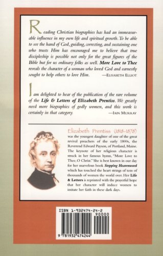Elizabeth Prentiss touched the hearts of many, as the author of Stepping Heavenward, and hymn "More Love to Thee, O Christ." She lived a Godly life despite many demands and difficulty, illness and loss. This biography of her life presents a positive and Christlike example for women today.