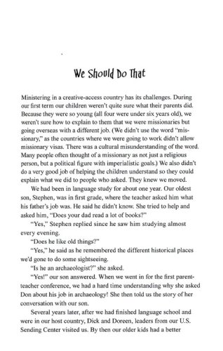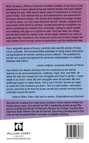 More Screams, Different Deserts is another invitation to join Sue on her adventures in cross-cultural living, and biblical studies that have helped her along the way. With twenty-seven years of experience in cross cultural ministry, Sue realizes that joy and perseverance are essential for thriving in life and ministry. Her stories and insights encourage women to look to Jesus, our only hope wherever we live. Stories, ranging from one corner of the world to another, include discovering a forgotten museum, protecting her children from chocolate, visiting a camel market, and meeting wild pigs on a nighttime walk. God has been her refuge, and his Word held her steady when all she really wanted to do was run away and hide. Questions and resources at the end of each chapter will help readers think through personal application and find additional help. Softcover.