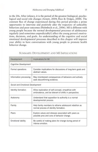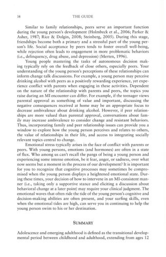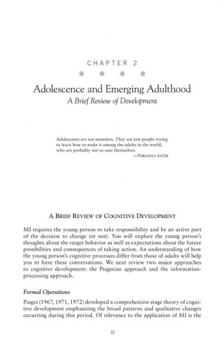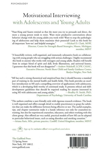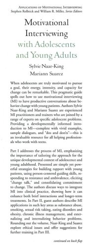 This pragmatic guide spells out how to use motivational interviewing (MI) to have productive conversations about behavior change with adolescents and young adults in any clinical context. Filled with vivid examples, sample dialogues, and "dos and don'ts," the book shows how conducting MI from a developmentally informed standpoint can help practitioners quickly build rapport with young patients, enhance their motivation to make healthy changes, and overcome ambivalence. Experts on specific adolescent problems describe MI applications in such key areas as substance abuse, smoking, sexual risk taking, eating disorders and obesity, chronic illness management, and externalizing and internalizing behavior problems.