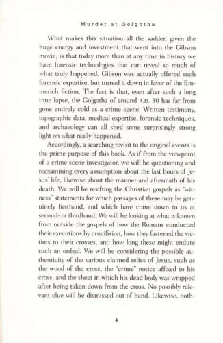Murder at Golgotha approaches Jesus' crucifixion from the perspective of a crime scene investigator: What do we know is fact? What can be historically documented? What can we deduce may have happened?