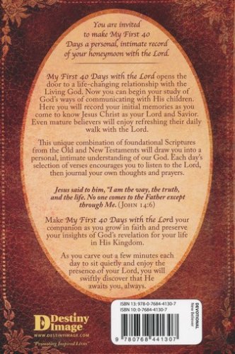 My First 40 Days with the Lord opens the door to a life-changing relationship with the Living God. Now you can begin your study of God’s ways of communicating with His children. Here you will record your initial memories as you come to know Jesus Christ as your Lord and Savior. Even mature believers will enjoy refreshing their daily walk with the Lord. This unique combination of foundational Scriptures from the Old and New Testaments will draw you into a personal, intimate understanding of our God. Each day’s selection of verses encourages you to listen to the Lord, then journal your own thoughts and prayers.