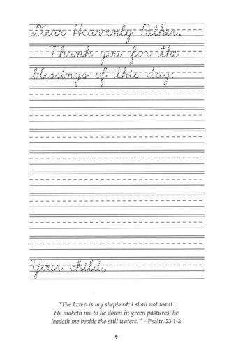 Book II is for intermediate writers (ages 9-12 or comparable skill level). This level provides a more advanced, smaller, font size and faded dotted-line prompts. Children are supplied with a correct form for letter writing (greeting, indentation for body, closing) in every lesson; they're also given the opportunity to write in paragraph form. Each entry begins "Dear Heavenly Father," and closes"Your child," with space for the signature.