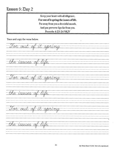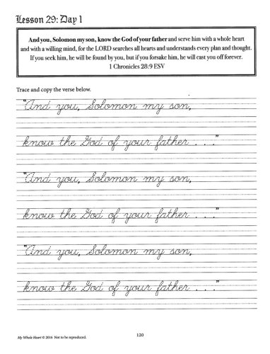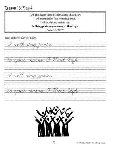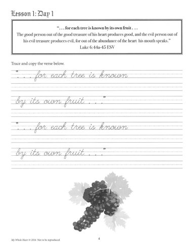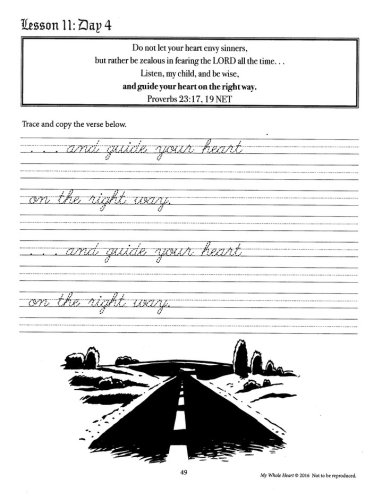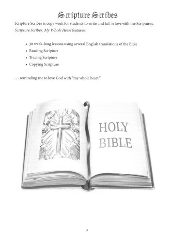 My Whole Heart is part of the "Scripture Scribe" handwriting/copy-work series from Laurelwood Books. Featuring verses that refer to the heart, lessons encourage students to love God with all of our heart. My Whole Heart has thirty lessons, with each lesson covering four days of work to cover a complete school year. This book expects the student to write in cursive. Grades 2 – 3, however can be used by older students needing a larger font.
