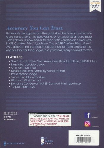 Universally recognized as the gold standard among word-for-word translations, the beloved New American Standard Bible, 1995 Edition, is now easier to read with Zondervan’s exclusive NASB Comfort Print® typeface. Available in a variety of sophisticated designs, the NASB Thinline Bible, Giant Print gives you the translation celebrated for faithfulness to the original biblical languages in a portable, easy-to-read format.