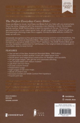 The full text of the New American Standard Bible, 1995 EditionDurable brown buffalo leather cover with raised spine hubsSmyth-sewn and edge-lined construction for flexibility and durabilityArt-gilt page edges, with gilt line and perimeter stitchingTwo double-sided satin ribbon markers, each 3/8-inch wideLess than one inch thickDouble-column formatPresentation pageEight pages of full-color mapsWords of Jesus in redExclusive Zondervan NASB Comfort Print typeface9-point print size