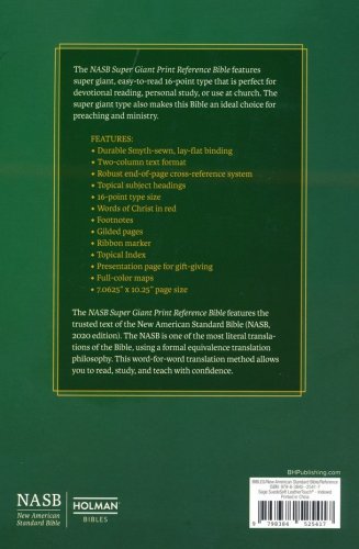 The NASB Super Giant Print Bible features the trusted text of the New American Standard Bible (NASB, 2020 Edition). The NASB is one of the most literal translations of the Bible, using a formal equivalence translation philosophy. This word-for-word translation method allows you to read, study, and teach with confidence.