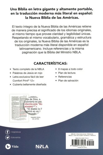 SPANISH EDITION: The full text of the Nueva Biblia de las Américas retains accurately the meaning of the original languages, providing at the same time of unique clarity and legibility. Keeping the same vocabulary, the grammar, and the structure of the original languages, the Nueva Biblia de las Américas is the most literal modern translation of the Bible available in Latin American Spanish.