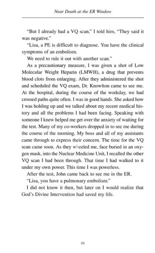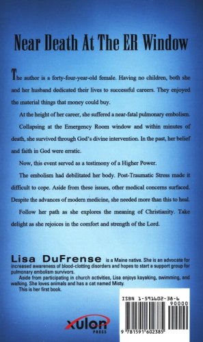 Lisa Dufrense was a healthy woman in her early forties when she nearly died from a pulmonary embolism. In Near Death at the ER Window, she shares what happened the day she collapsed in the ER, how God intervened to save her, and lessons she's learned in the recovery process.