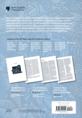 Stunning artwork by Stephen Crotts and a brief introduction lead into each book of the BibleConcise set of NET translator notesThe New English Translation, known to be a trusted, readable, and accurate Bible translation for the 21st centuryFull-color mapsGilded page edgesTraditional sewn binding for flexibility and durabilityTwo satin ribbonsExclusive Thomas Nelson NET Comfort Print® in line-matched 10.5-point type