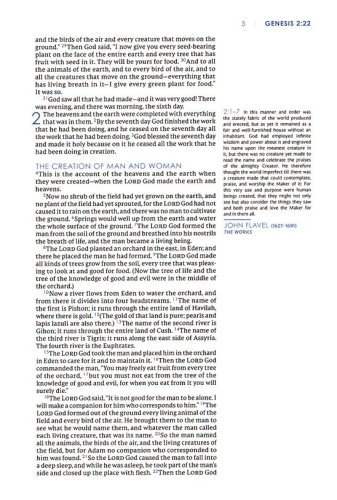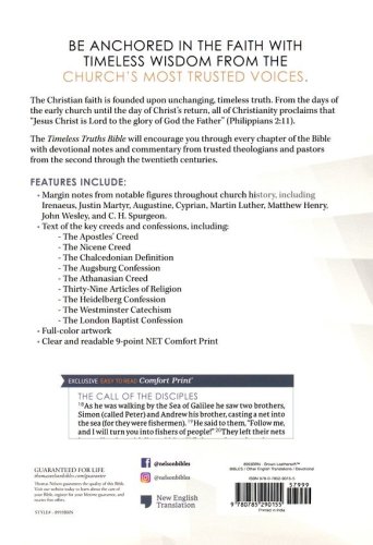 Margin notes featuring devotional length commentary for every chapter of the Bible from notable figures throughout church historyText from some of the creeds and confessions of the Christian faith that have shaped our beliefs for generations, including:The Apostles' CreedThe Nicene CreedThe Chalcedonian DefinitionThe Athanasian CreedThe Augsburg ConfessionThe Belgic ConfessionThe Westminster CatechismThe Lausanne CovenantBook Introductions for every book of the BibleFull-color tip-in pages of artwork from the history of ChristianityLine-matched, single-column typesettingClear and readable 9-point NET Comfort Print