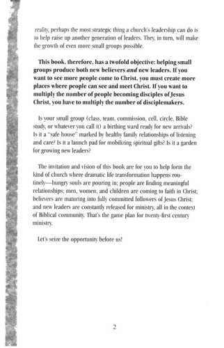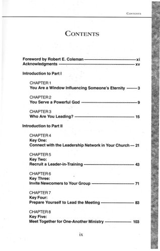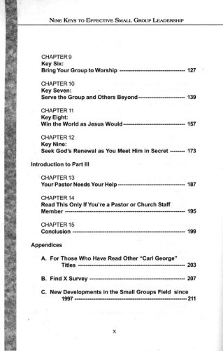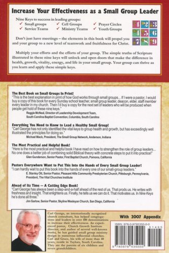 A survey of resources about small groups at the beginning of the 1990s led to a discovery: Many books on small groups carried an instructional content and touched on groups as instrumental in delivery of that specific subject matter. How a leader was to function relative to a group was discussed as a matter of how to manage an instructional hour. The potential of groups for making connections and building community and serving others was largely unrecognized. What a group leader might do to pull together and maintain a group, or how a group leader might become acknowledged as part of a larger leadership strategy for service and outreach was simply unaddressed. From the insights developed in his complex and widely recommended Prepare Your Church for the Future, best-selling author Carl George extracts the most basic, practical elements of how an individual leader can contribute to the well-being of others and the overall organization. He interprets the role of a group leader in language that is easily understood and remembered: nine commitments leading to a partnership with professional church leaders. Pastors and church consultants consistently report that the people exposed to these nine keys are easy to work with. They readily grasp the reasonableness of the principles, which help them be trustworthy team players in this matter of shared ministry. From the forward, by Robert Coleman, Director of the Billy Graham Institute: "This book speaks to our need for practical leadership training. With profound simplicity, it describes how small groups grow through loving relationships as readers build up one another in the faith. More importantly, the reader learn ways to prepare yourself for leadership in the group. The sequential steps show readers how to bring others into the circle of love, and in the process, how to enlarge your outreach by multiplying disciple makers." This 2007 edition includes an updated Appendix, describing recent developments in the fi