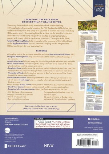 Complete text of the accurate, readable, and clear New International Version (NIV)Original Meaning Notes help you understand the meaning of each passage in its context.Application Notes help you integrate the teachings of the Bible into your daily life.Book Introductions provide perspective and application for every book of the Bible, plus timelines, reading guides, and more. People to Know articles show the good and bad of Bible characters’ lives, how God accomplished his purposes through them, and lessons we can learn from them about living a faithful life.Character of God articles explore aspects of God’s character and what these mean for our lives as believers.Questions for Growth in each chapter of the Bible encourage reflection on how to apply Scripture to life.45 full-color in-text maps help you visually follow along with the locations of biblical events.More than 50 in-text charts make complex information quickly understandable.Chart Your Course includes topical, annual, and three-year reading plans to help you study at your own pace.Engaging full-color page design makes the features pop within the text.NIV Dictionary-Concordance16-page full-color map sectionWords of Jesus in redTwo satin ribbon markersEuropean bonded leather cover lies flat when openExclusive Zondervan NIV Comfort Print® typefacePrint Size: 9.5