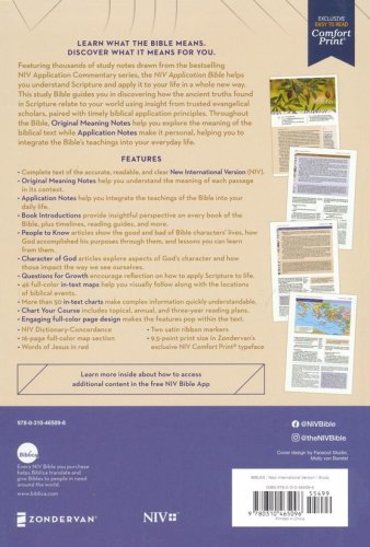 Complete text of the accurate, readable, and clear New International Version (NIV)Original Meaning Notes help you understand the meaning of each passage in its context.Application Notes help you integrate the teachings of the Bible into your daily life.Book Introductions provide perspective and application for every book of the Bible, plus timelines, reading guides, and more. People to Know articles show the good and bad of Bible characters’ lives, how God accomplished his purposes through them, and lessons we can learn from them about living a faithful life.Character of God articles explore aspects of God’s character and what these mean for our lives as believers.Questions for Growth in each chapter of the Bible encourage reflection on how to apply Scripture to life.45 full-color in-text maps help you visually follow along with the locations of biblical events.More than 50 in-text charts make complex information quickly understandable.Chart Your Course includes topical, annual, and three-year reading plans to help you study at your own pace.Engaging full-color page design makes the features pop within the text.NIV Dictionary-Concordance16-page full-color map sectionWords of Jesus in redTwo satin ribbon markersExclusive Zondervan NIV Comfort Print® typefacePrint Size: 9.5