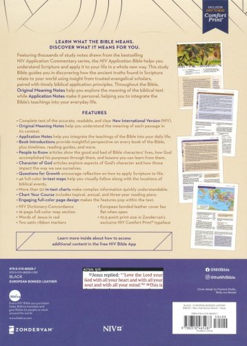 Complete text of the accurate, readable, and clear New International Version (NIV)Original Meaning Notes help you understand the meaning of each passage in its context.Application Notes help you integrate the teachings of the Bible into your daily life.Book Introductions provide perspective and application for every book of the Bible, plus timelines, reading guides, and more. People to Know articles show the good and bad of Bible characters’ lives, how God accomplished his purposes through them, and lessons we can learn from them about living a faithful life.Character of God articles explore aspects of God’s character and what these mean for our lives as believers.Questions for Growth in each chapter of the Bible encourage reflection on how to apply Scripture to life.45 full-color in-text maps help you visually follow along with the locations of biblical events.More than 50 in-text charts make complex information quickly understandable.Chart Your Course includes topical, annual, and three-year reading plans to help you study at your own pace.Engaging full-color page design makes the features pop within the text.NIV Dictionary-Concordance16-page full-color map sectionWords of Jesus in redTwo satin ribbon markersEuropean bonded leather cover lies flat when openExclusive Zondervan NIV Comfort Print® typefacePrint Size: 10.5