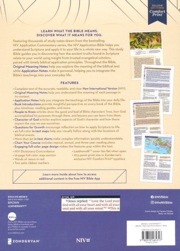 Complete text of the accurate, readable, and clear New International Version (NIV)Original Meaning Notes help you understand the meaning of each passage in its context.Application Notes help you integrate the teachings of the Bible into your daily life.Book Introductions provide perspective and application for every book of the Bible, plus timelines, reading guides, and more. People to Know articles show the good and bad of Bible characters’ lives, how God accomplished his purposes through them, and lessons we can learn from them about living a faithful life.Character of God articles explore aspects of God’s character and what these mean for our lives as believers.Questions for Growth in each chapter of the Bible encourage reflection on how to apply Scripture to life.45 full-color in-text maps help you visually follow along with the locations of biblical events.More than 50 in-text charts make complex information quickly understandable.Chart Your Course includes topical, annual, and three-year reading plans to help you study at your own pace.Engaging full-color page design makes the features pop within the text.NIV Dictionary-Concordance16-page full-color map sectionWords of Jesus in redTwo satin ribbon markersThumb indexed to make finding the books of the Bible easierLeathersoft™ cover lies flat when openExclusive Zondervan NIV Comfort Print® typefacePrint Size: 10.5