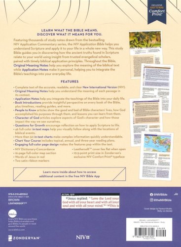 Complete text of the accurate, readable, and clear New International Version (NIV)Original Meaning Notes help you understand the meaning of each passage in its context.Application Notes help you integrate the teachings of the Bible into your daily life.Book Introductions provide perspective and application for every book of the Bible, plus timelines, reading guides, and more. People to Know articles show the good and bad of Bible characters’ lives, how God accomplished his purposes through them, and lessons we can learn from them about living a faithful life.Character of God articles explore aspects of God’s character and what these mean for our lives as believers.Questions for Growth in each chapter of the Bible encourage reflection on how to apply Scripture to life.45 full-color in-text maps help you visually follow along with the locations of biblical events.More than 50 in-text charts make complex information quickly understandable.Chart Your Course includes topical, annual, and three-year reading plans to help you study at your own pace.Engaging full-color page design makes the features pop within the text.NIV Dictionary-Concordance16-page full-color map sectionWords of Jesus in redTwo satin ribbon markersLeathersoft™ cover lies flat when openExclusive Zondervan NIV Comfort Print® typefacePrint Size: 10.5
