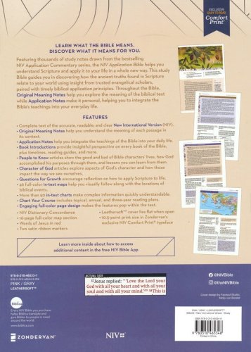 Complete text of the accurate, readable, and clear New International Version (NIV)Original Meaning Notes help you understand the meaning of each passage in its context.Application Notes help you integrate the teachings of the Bible into your daily life.Book Introductions provide perspective and application for every book of the Bible, plus timelines, reading guides, and more. People to Know articles show the good and bad of Bible characters’ lives, how God accomplished his purposes through them, and lessons we can learn from them about living a faithful life.Character of God articles explore aspects of God’s character and what these mean for our lives as believers.Questions for Growth in each chapter of the Bible encourage reflection on how to apply Scripture to life.45 full-color in-text maps help you visually follow along with the locations of biblical events.More than 50 in-text charts make complex information quickly understandable.Chart Your Course includes topical, annual, and three-year reading plans to help you study at your own pace.Engaging full-color page design makes the features pop within the text.NIV Dictionary-Concordance16-page full-color map sectionWords of Jesus in redTwo satin ribbon markersThumb indexed to make finding the books of the Bible easierLeathersoft™ cover lies flat when openExclusive Zondervan NIV Comfort Print® typefacePrint Size: 10.5
