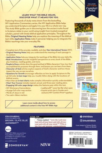 Complete text of the accurate, readable, and clear New International Version (NIV)Original Meaning Notes help you understand the meaning of each passage in its context.Application Notes help you integrate the teachings of the Bible into your daily life.Book Introductions provide perspective and application for every book of the Bible, plus timelines, reading guides, and more. People to Know articles show the good and bad of Bible characters’ lives, how God accomplished his purposes through them, and lessons we can learn from them about living a faithful life.Character of God articles explore aspects of God’s character and what these mean for our lives as believers.Questions for Growth in each chapter of the Bible encourage reflection on how to apply Scripture to life.45 full-color in-text maps help you visually follow along with the locations of biblical events.More than 50 in-text charts make complex information quickly understandable.Chart Your Course includes topical, annual, and three-year reading plans to help you study at your own pace.Engaging full-color page design makes the features pop within the text.NIV Dictionary-Concordance16-page full-color map sectionWords of Jesus in redTwo satin ribbon markersThumb indexed to make finding the books of the Bible easierLeathersoft™ cover lies flat when openExclusive Zondervan NIV Comfort Print® typefacePrint Size: 8