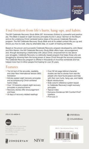 The full text of the accurate, readable, and clear New International Version (NIV) translationArticles explain eight recovery principles and accompanying Christ-centered twelve stepsOver 110 lessons unpack eight recovery principles in practical termsRecovery stories offer encouragement and hope30 days of recovery-related readingsOver 50 full-page biblical character studies are tied to stories from real-life people who have found peace and help with their own hurts, hang-ups, and habitsBook introductionsSide-column reference system keyed to Celebrate Recovery’s eight recovery principlesTopical indexExclusive Zondervan NIV Comfort Print typefacePrint Size: 9