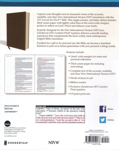 Complete text of the accurate, readable, and clear New International Version (NIV)Lined, wide margins for notes and reflectionsThicker cream paper for enduring note-takingRibbon markerLeathersoft cover lays flay when openWords of Christ in redExclusive Zondervan NIV Comfort Print® typeface9.5-point print size