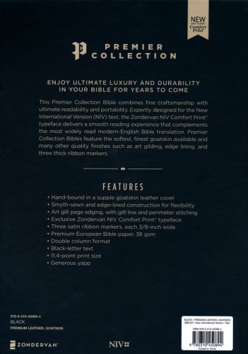 Complete text of the readable, accurate and clear New International Version (NIV)Hand-bound in a supple goatskin leather coverSmyth-sewn and edge-lined construction for flexibilityArt gilt blue-under-silver page edging, with gilt line and perimeter stitchingThree satin ribbon markers, each 3/8-inch widePremium European Bible paper, 36 gsmLess than one inch thickDouble column formatBlack-letter textGenerous yappExclusive Zondervan NIV Comfort Print® typeface11.4-point print size
