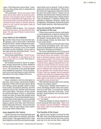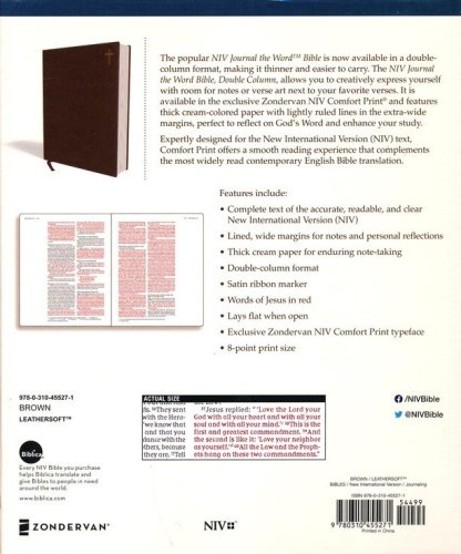 Complete text of the accurate, readable, and clear New International Version (NIV)Lined, wide margins for notes and personal reflectionsThick cream paper for enduring note-takingDouble-column formatSatin ribbon markerWords of Jesus in redLeathersoft cover lies flat when openExclusive Zondervan NIV Comfort Print typeface8-point print size