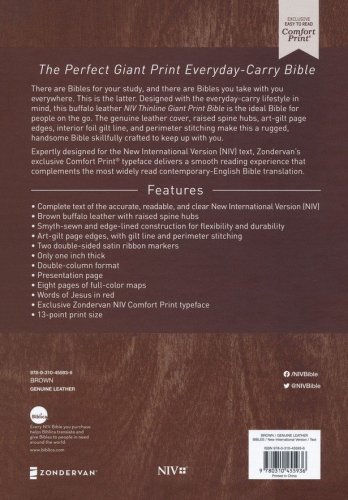 There are Bibles for your study and Bibles you take with you. This is the latter. Designed with the everyday-carry lifestyle in mind, this buffalo leather NIV Thinline Giant Print Bible is the ideal Bible for people on the go. The genuine leather cover, raised spine hubs, art-gilt page edges, gilt line, and perimeter stitching make this a rugged, handsome Bible skillfully crafted to keep up with you.