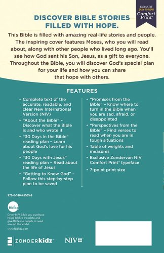 Complete text of the accurate, readable, and clear New International Version (NIV)"About the Bible" – Discover what the Bible is and who wrote it"30 Days in the Bible" reading plan – Learn about God’s love for his people"30 Days with Jesus" reading plan – Read about the life of Jesus"Getting to Know God" – Follow this step-by-step plan to be saved"Promises from the Bible" – Know where to turn in the Bible when you are sad, afraid, or disappointed"Perspectives from the Bible" – Find verses to read when you are in tough situationsTable of weights and measuresExclusive Zondervan NIV Comfort Print® typeface7-point print sizePack of 40 Bibles ideal for bulk purchases
